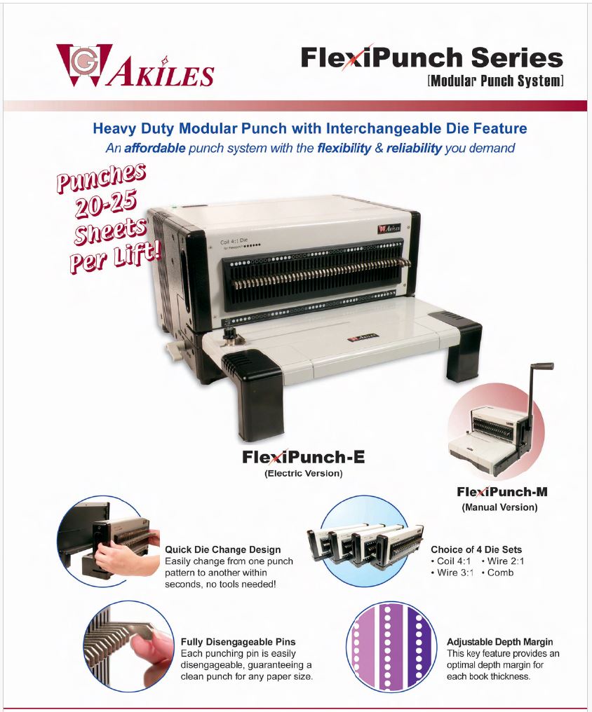 The FlexiPunch-E offers a cost-effective, versatile modular punching solution, ideal for various binding tasks in your daily workflow. Easily switch between coil, wire, or comb binding projects using the same main punch unit. Equipped with durable, high-precision die sets designed for long-term use, this machine ensures consistent, high-quality results. Each unit includes one die set of your choice, allowing immediate customization to meet your specific binding needs.