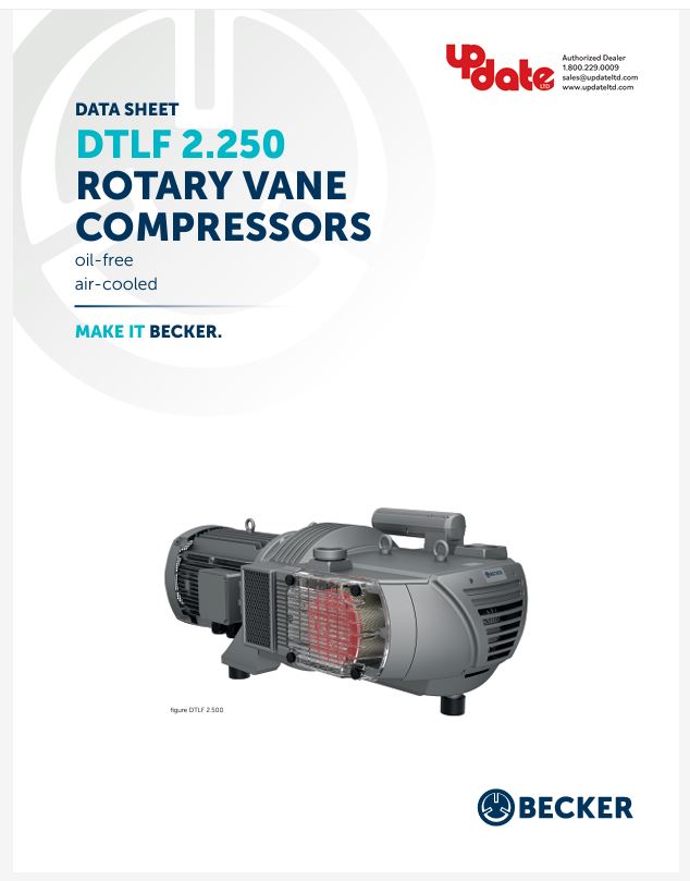 The DTLF 2.250 is a low pressure, dry displacement pump. It's rugged and durable design provides continuous operation for printing, packaging, and other industrial applications. The pump utilizes self-lubricating graphite vanes, requires minimal maintenance, and removes the need for oil changes. Each unit comes standard with a built-in inlet filter, a pressure relief valve, vibration isolators, and discharge silencers.