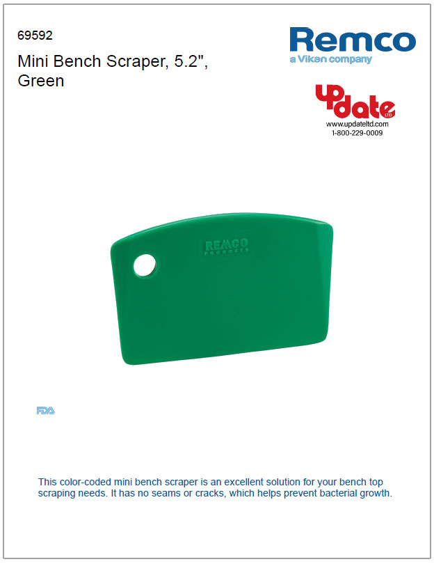 This mini bench scraper, color-coded for convenience, is perfect for all your bench top scraping tasks. Its seamless and crack-free design helps inhibit bacterial buildup.