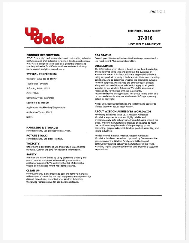 This spine glue is an EVA hot melt designed for use as a one-shot book binding adhesive. It binds well to uncoated stocks.