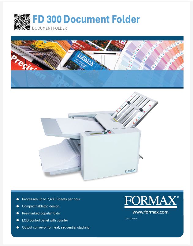 The Formax FD 300 Desktop Paper Folder is a compact and efficient machine designed for low-volume folding tasks, capable of processing up to 7,400 sheets per hour. It accommodates 11" and 14" paper sizes and offers pre-marked settings for four popular folds, making it easy to set up and use. With a user-friendly LCD control panel, AutoBatch functionality, and a drop-in top-feed system, it ensures quick, neat, and consistent results, making it ideal for small offices, schools, and churches looking to streamline document preparation and enhance presentation quality.