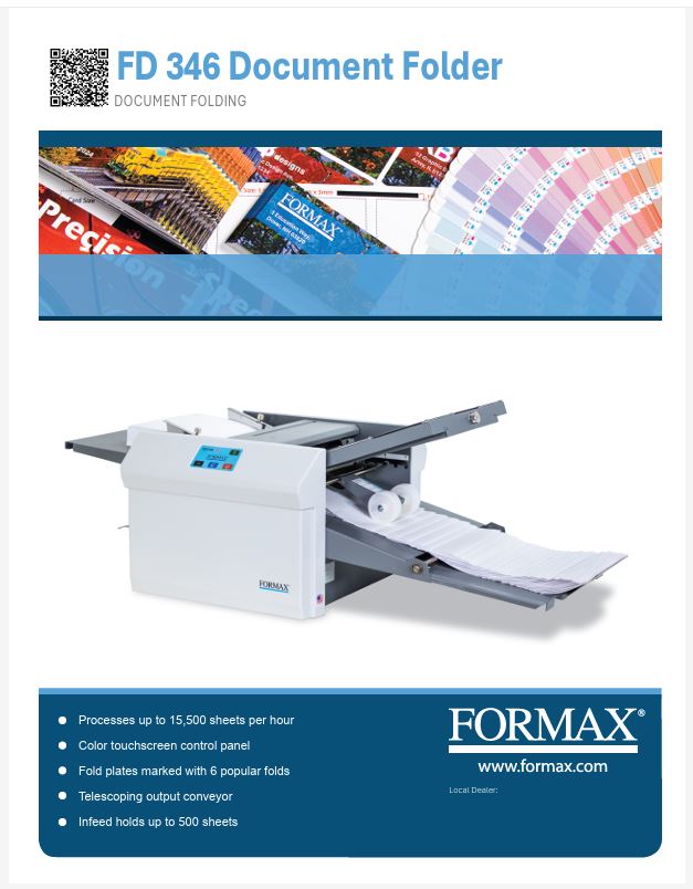 The Formax FD 346 Desktop Paper Folder combines professional-grade performance with a user-friendly touchscreen interface, making it ideal for churches, schools, and small businesses. Capable of folding up to 15,500 sheets per hour and offering advanced features like cross-folding, a telescoping conveyor, and an optional Multi-Sheet Feeder, it delivers high-efficiency document processing with minimal effort.