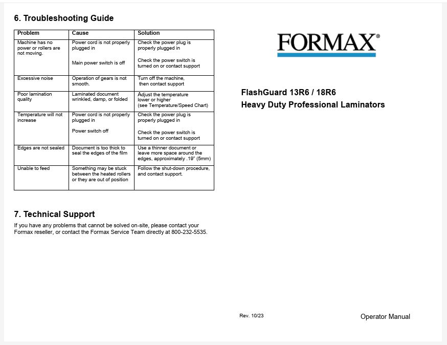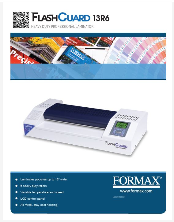 The FlashGuard 13R6 Heavy-Duty Laminator is built for high-volume environments, handling pouches up to 13" wide and 14 mil thick to deliver professional, bubble-free results for everything from IDs to signage. With a user-friendly LCD control panel, customizable settings, six heavy-duty rollers, and both hot and cold lamination modes, it offers speed, precision, and versatility for consistent, high-quality document protection.