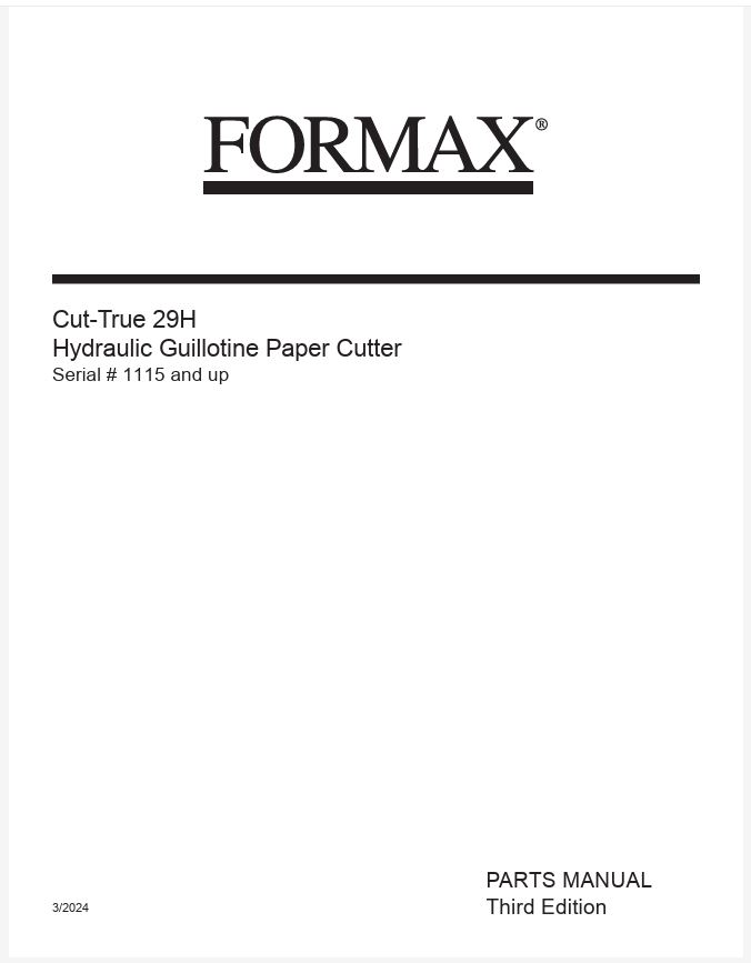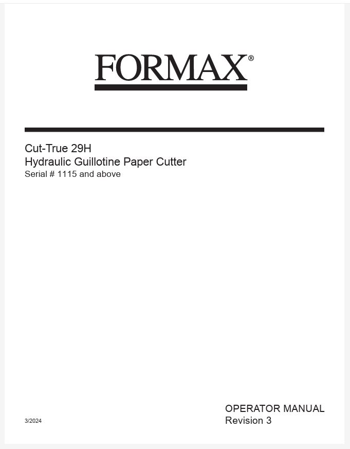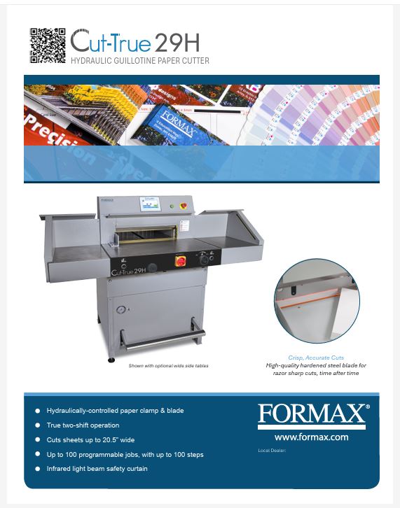 The Formax Cut-True 29H Hydraulic Guillotine Paper Cutter enhances print production with precise, high-capacity cutting, a programmable touchscreen interface, and advanced safety features like an infrared light curtain. Its adjustable hydraulic clamp and LED cutting guide ensure clean, accurate cuts on various materials, making it ideal for professional print shops and finishing operations.