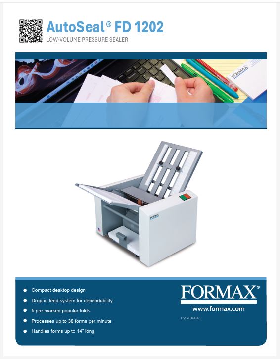 The Formax AutoSeal FD 1202 is a compact, low-volume pressure sealer that simplifies and speeds up office mailing by folding and sealing up to 38 forms per minute—no envelopes needed. With easy-to-use controls, multiple fold options, and a space-saving design, it’s an ideal solution for small to mid-sized businesses looking to streamline mail processing and cut costs.