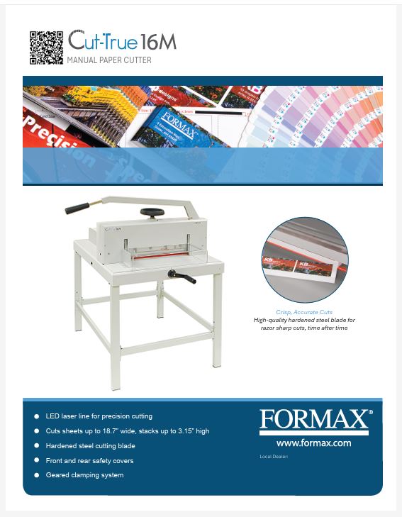 The Formax Cut-True 16M is a manual guillotine cutter designed for precision and efficiency, featuring a hardened-steel blade and lever-activated arm to cut paper stacks up to 3.15" thick. With safety features like transparent covers and a blade lock, plus tools for fine adjustments such as an LED laser line and back gauge, it’s ideal for professional print environments seeking accurate, high-quality results.