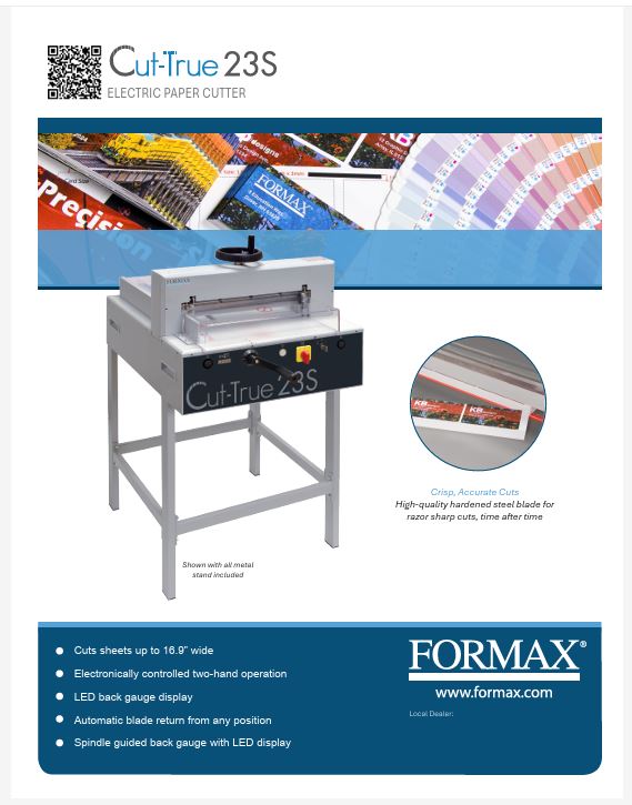 The Formax Cut-True 23S Semi-Automatic Electric Cutter delivers accurate, effortless cutting for paper stacks up to 16.9" wide and 1.77" high, using a two-button electronic operation and a hardened-steel guillotine blade. With precision tools like a spindle-guided back gauge, LED laser line, and multiple built-in safety features, it’s a reliable and versatile solution for print shops and finishing environments.