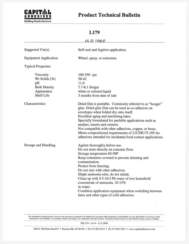 • Meets compositional requirements of 21CFR175.105 for adhesives intended for incidental food contact applications.