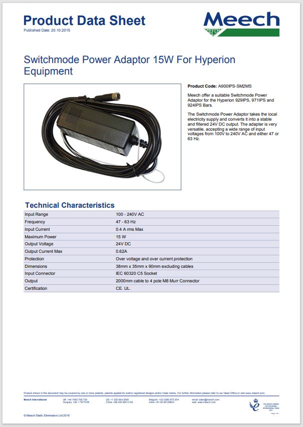 This power cable is used with the Hyperion Static Bar models and Ionizing Nozzle Power Supply's offered by Meech. The transformer converts 100-240V AC input to 24V DC output to be used by the bar or power supply. One end is a grounded three prong plug and the other is a M8 4 pin connector.