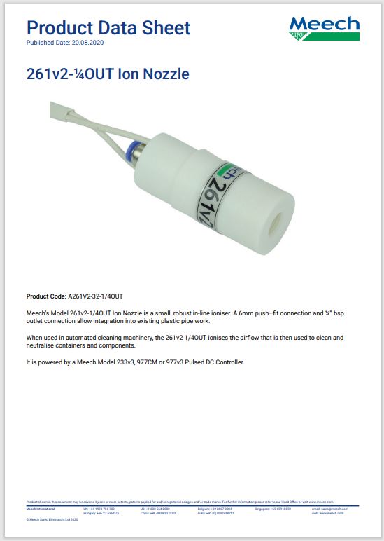 The Meech Model 261v2-1/4OUT Ion Nozzle is a compact and durable ionizer designed for inline use. With its 6mm push-fit inlet and ¼” BSP outlet, it can seamlessly integrate into pre-existing air pipelines.