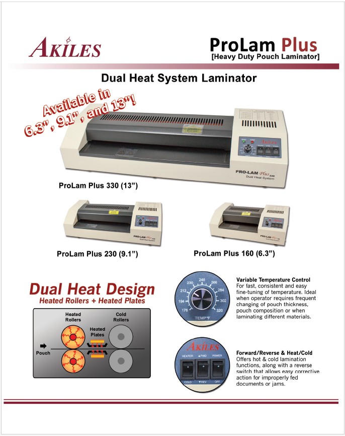 The Akiles ProLam Plus 160 is a dual heat system laminator for photos and ink-jet print outs.
