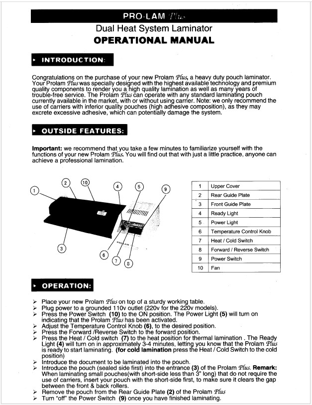 • Variable Temp Control - fast and easy temperature changes for fine tuning ideal laminating quality