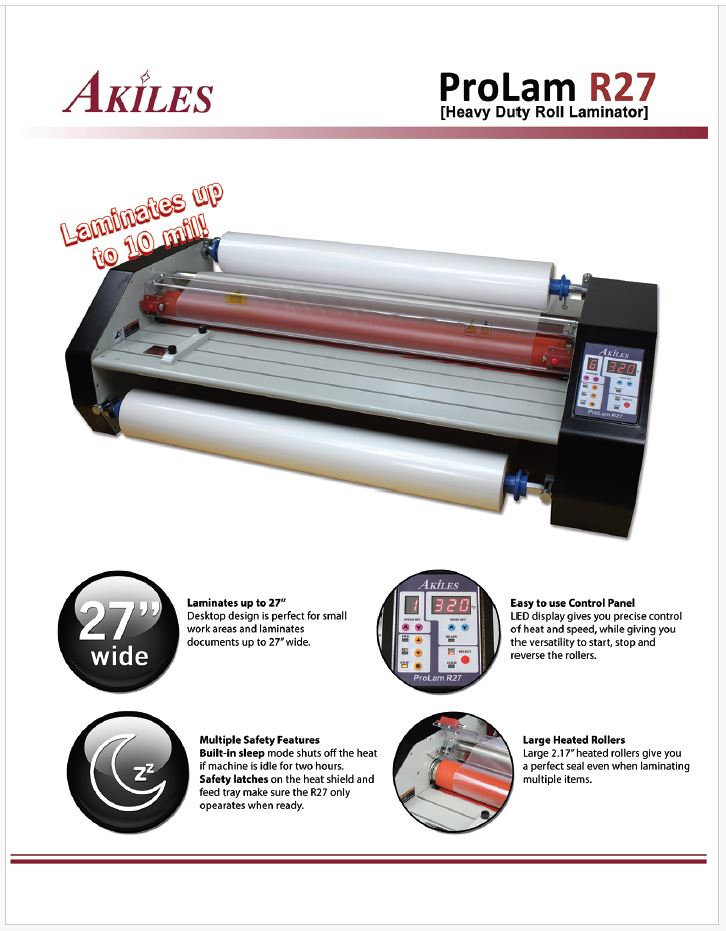 The Akiles ProLam R27 is a robust, table-top laminator ideal for schools/businesses. It laminates up to 27" wide and 1.5-10 mil film. Easy to use, it's a versatile machine for demanding projects.