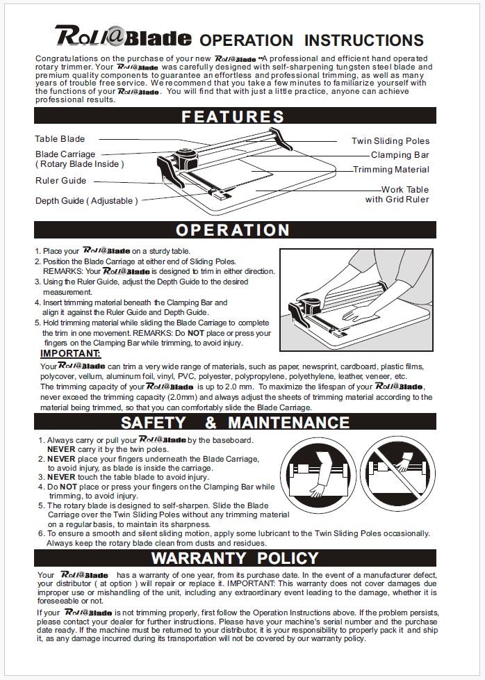 • Transparent Clamping Bar - Holds the trimming material in place while allowing you to monitor the trimming process.