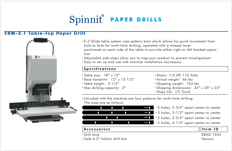 Spinnit EBM-2.1 Paper Drill w/ E-Z Glide Table