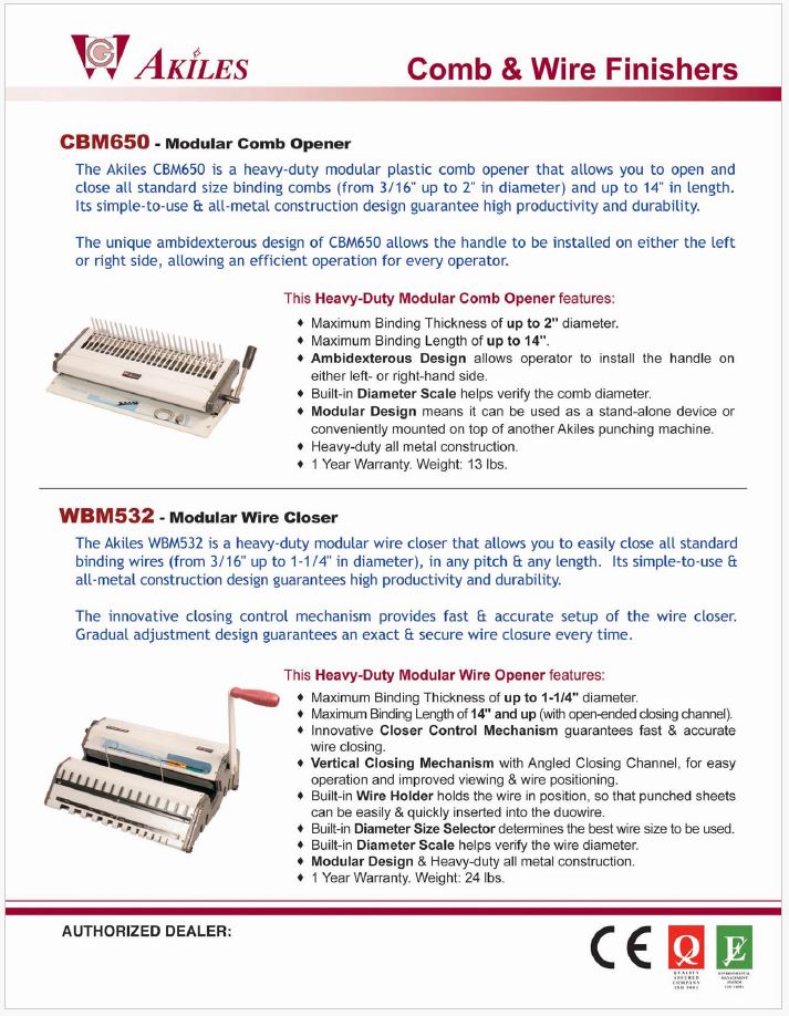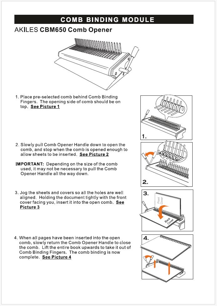 The Akiles CBM650 is a heavy-duty modular plastic comb opener that allows you to open and close all standard size binding combs (from 1/4? up to 2? in diameter) and up to 14? in length. Its simple-to-use & all-metal construction design guarantee high productivity and durability.