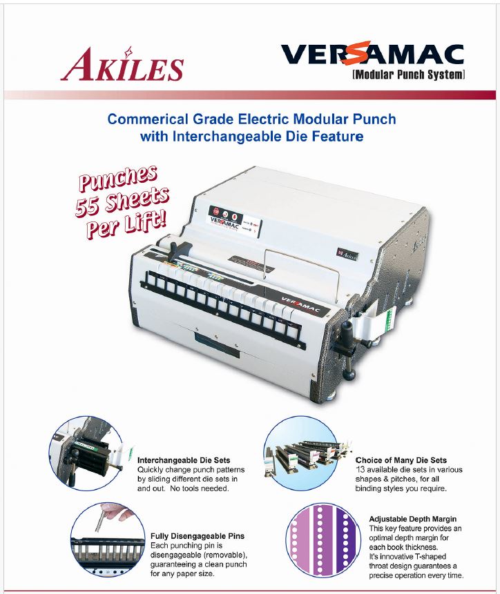The Akiles® VersaMac stands out with unmatched power and versatility in its class, making it a top choice for high-volume binding. Boasting a punch capacity of 55 sheets, easy interchangeable dies, and a robust modular design, it's perfect for all binding styles in commercial settings. Durable construction ensures reliability during crucial times, minimizing downtime. Its modular nature allows for future expansion by adding accessories and modules, enhancing value and ROI. The Akiles® VersaMac is your go-to for a productive, reliable punch system.