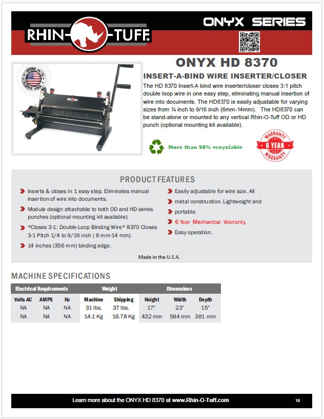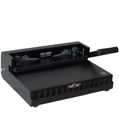 The Rhin-O-Tuff HD8370 14” Wire Closer is a versatile, precision tool for 3:1 pitch wire binding, handling wire sizes from 1/4" to 9/16". With its 14-inch binding edge and one-step operation, it threads and closes wire in a single motion—streamlining workflow and increasing productivity. Compact yet capable, it accommodates a range of document sizes from 5.5" to 14", making it ideal for everything from half-letter to legal-sized projects.