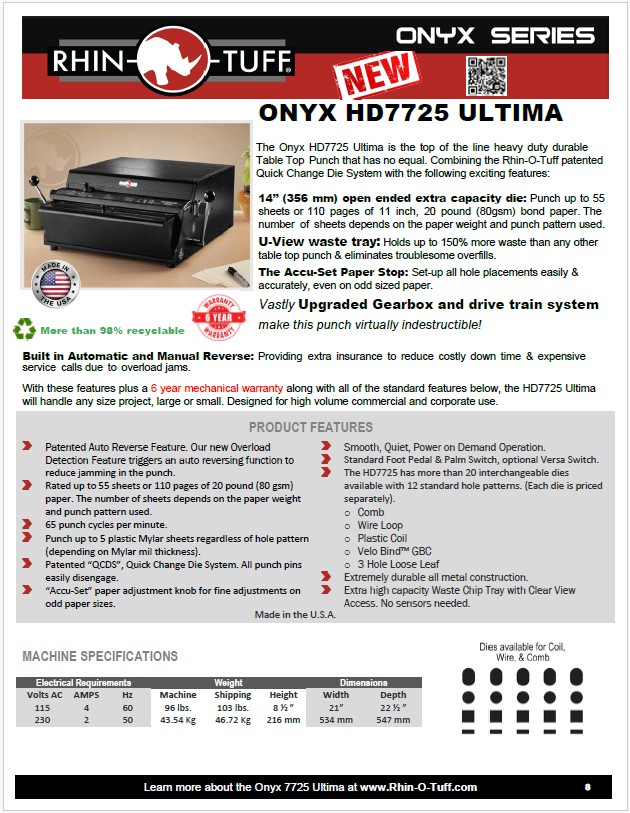 The Onyx HD7725 Ultima is a top-of-the-line, heavy-duty tabletop punching machine built for high-volume commercial and corporate use. Featuring a 14" open-ended die and a patented Quick Change Die System, it can punch up to 55 sheets (or 110 pages) of 20 lb. paper at 65 cycles per minute. The machine includes an automatic and manual jam-reverse function, the Accu-Set paper stop for precise alignment, and a U-View waste tray with 150% more capacity. With over 20 interchangeable dies available and a 6-year mechanical warranty, it's engineered for durability, precision, and unmatched productivity.