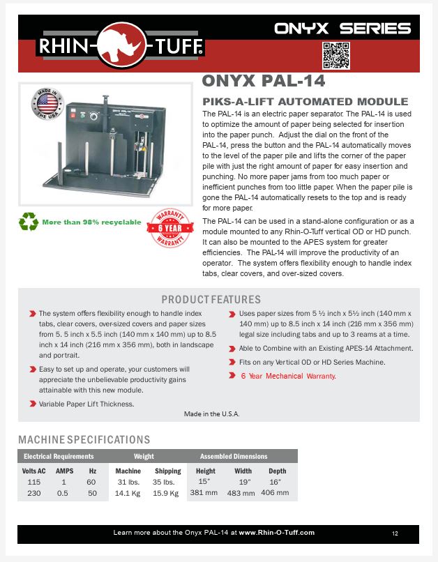 The Rhin-O-Tuff PAL-14 is a sheet separator that lifts a desired number of document pages.