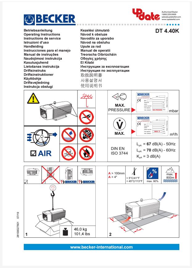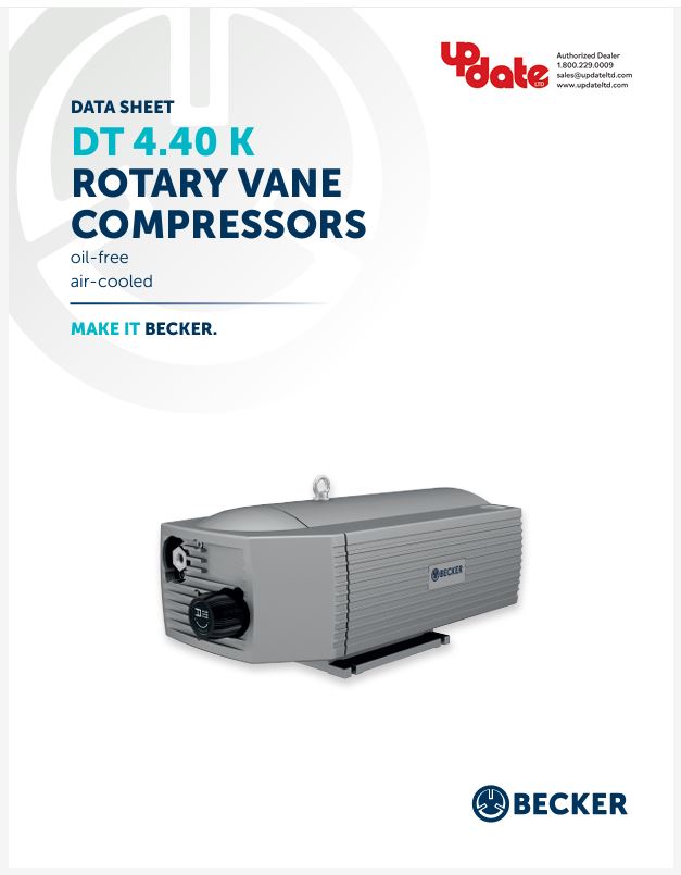 The DT 4.40 K is a low pressure, dry displacement pump. It's rugged and durable design provides continuous operation for printing, packaging, and other industrial applications. The pump utilizes self-lubricating graphite vanes, requires minimal maintenance, and removes the need for oil changes. Each unit comes standard with a built-in inlet filter, a pressure relief valve, vibration isolators, and discharge silencers.