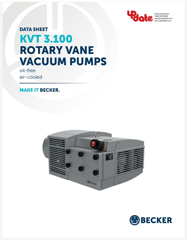 The KVT 3.100 is a dry displacement, medium vacuum pump. It's rugged and durable design provides continuous operation for printing, packaging, CNC routing and other industry applications. The pump utilizes self-lubricating graphite vanes, requires minimal maintenance, and removes the need for oil changes. Each unit comes standard with a built-in inlet filter, a vacuum regulating valve, vibration isolators, and discharge silencers.