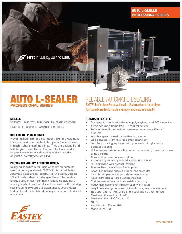 Proven reliable over and over again, EASTEY’s Automatic L-Sealers provide you with all the quality features found in much higher priced machines. They are designed and built to give you all the performance features needed for positive sealing a wide variety of films including polyolefin, polyethylene, and PVC.