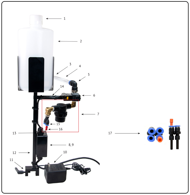 Includes the tank assembly, two score arm assemblies, two sets of 1" needles, a sensor and other standard parts (bar mount not included).